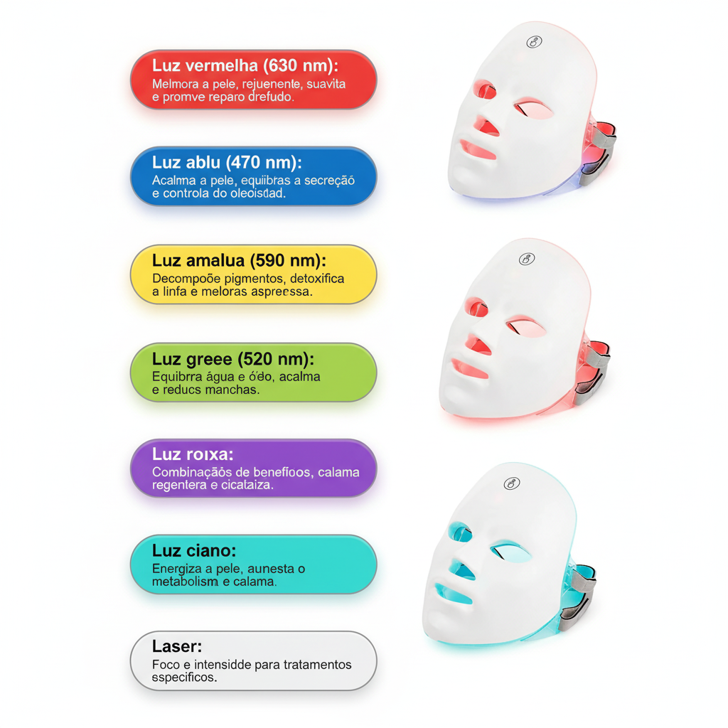 🔵 Luz Azul (470nm): controla oleosidade e ajuda no tratamento da acne.